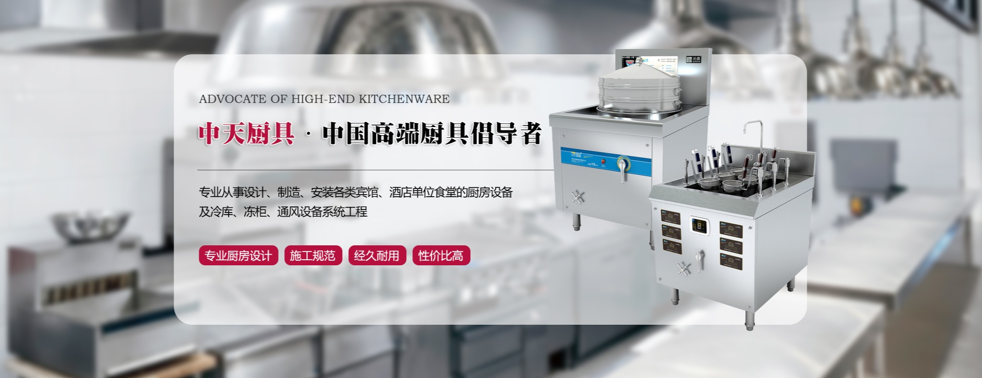 汕头市中天厨房设备有限公司于2010年在汕头市成立,是一家集商用厨具设备、商用厨房工程于一体的企业,专业从事设计、制造、安装各类宾馆、酒店、单位食堂的厨房设备及冷库、冻柜、通风设备系统工程;公司总部位于海滨邹鲁、著名侨乡的汕头市(潮汕平原)。主要提供酒店、宾馆、餐饮、政府、学校、医院、企业等商用厨房的不锈钢厨房设备,同时进行上门设计、定制产品、现场施工协调、提供厨房所需配置、计划将来节能环保等一系列工作和服务。